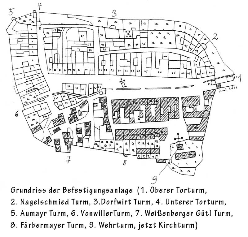 Entlang der Befestigungsmauer befanden sich weitere Türme, die heute nur mehr zum Teil erhalten sind und von den Bewohnern verschiedentlich genutzt werden. Der Obere Torturm, der den Markt nach Westen sicherte, wurde 1867 abgebrochen, der Nagelschmiedturm 2009. Nach dem Brand von 1826 wurde der Dorfwirtturm abgetragen. Im Unteren Torturm, dem NW Zugang zum Markt, wurde 1927 das Haslacher Heimatmuseum eingerichtet. Aumayrturm, die Reste des Vonwiller Turmes, der Weißenbergergütl – Turm und der Färbermayerturm ergänzen die Wehranlage.